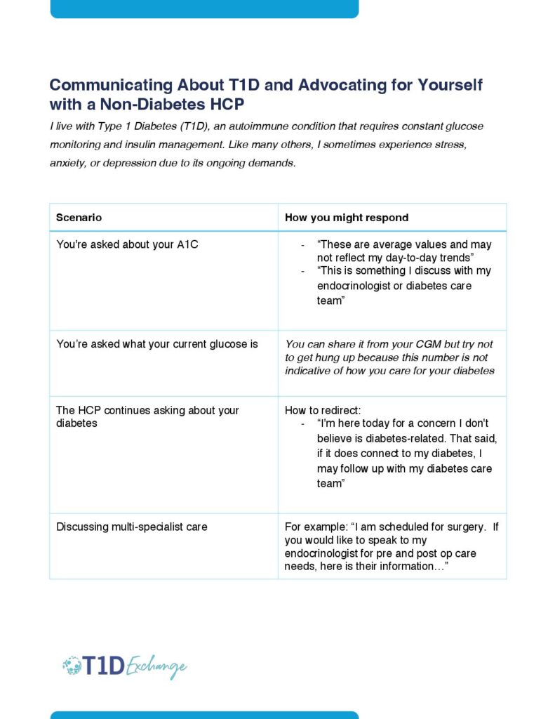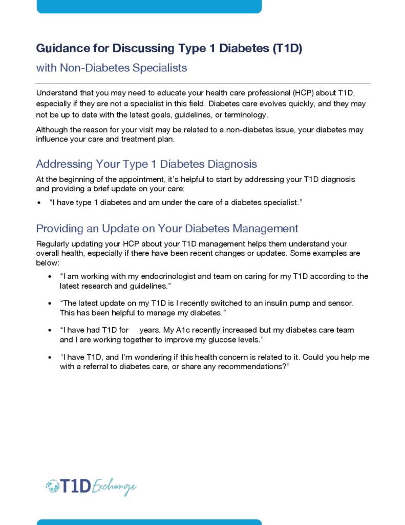The T1D Exchange PwD Committee has collaborated to create three reference guides for people living with type 1 diabetes (T1D). These guides offer practical insights on talking about T1D with non-diabetes specialists, self-advocacy and communication, and a quick-reference guide for caregivers. We encourage you to explore these resources for guidance and support when you need it.
